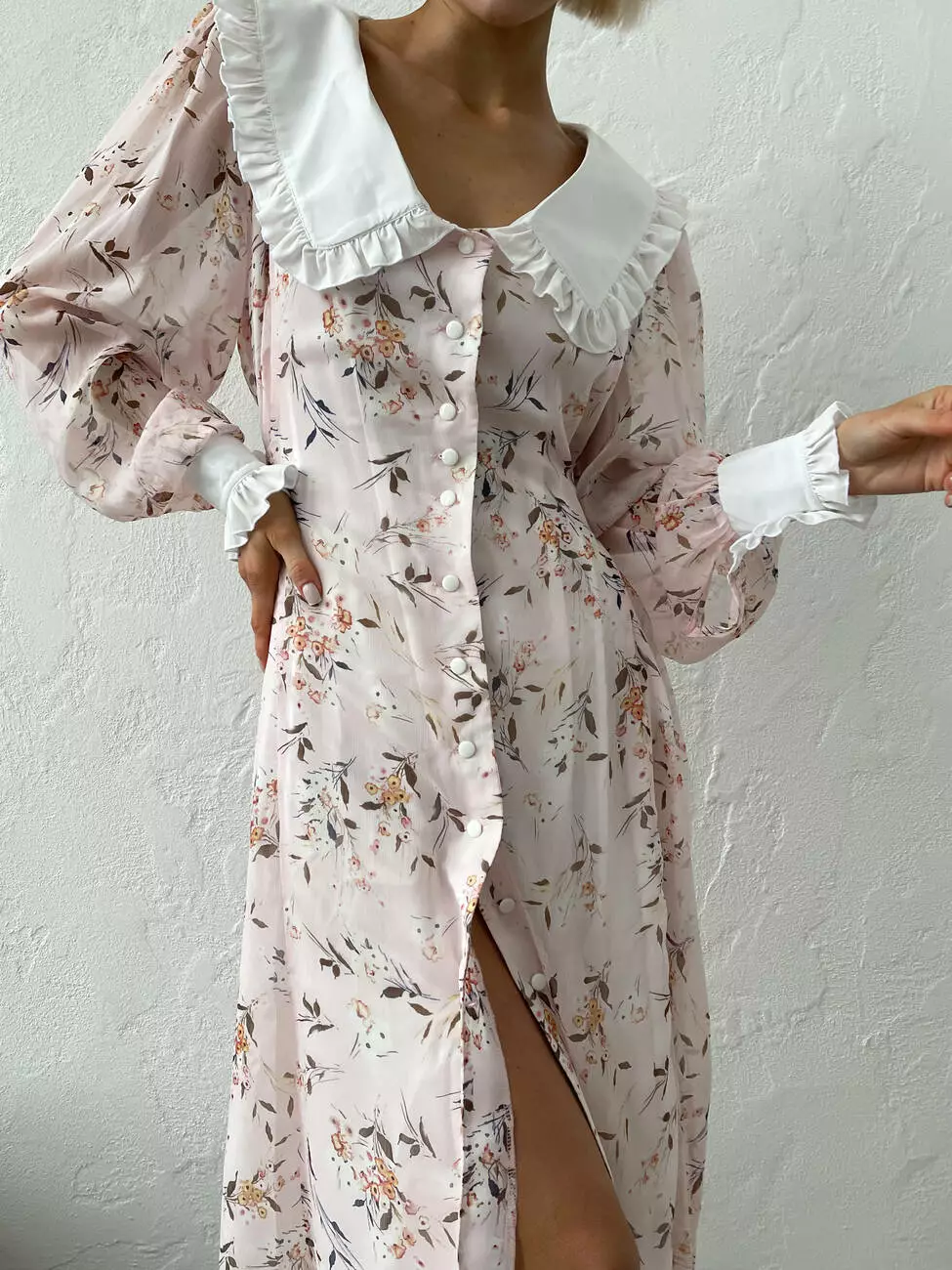 Жіноча шифонова сукня VENETTA з білим комірцем довжини міді з квітковим принтом пудрового кольору
