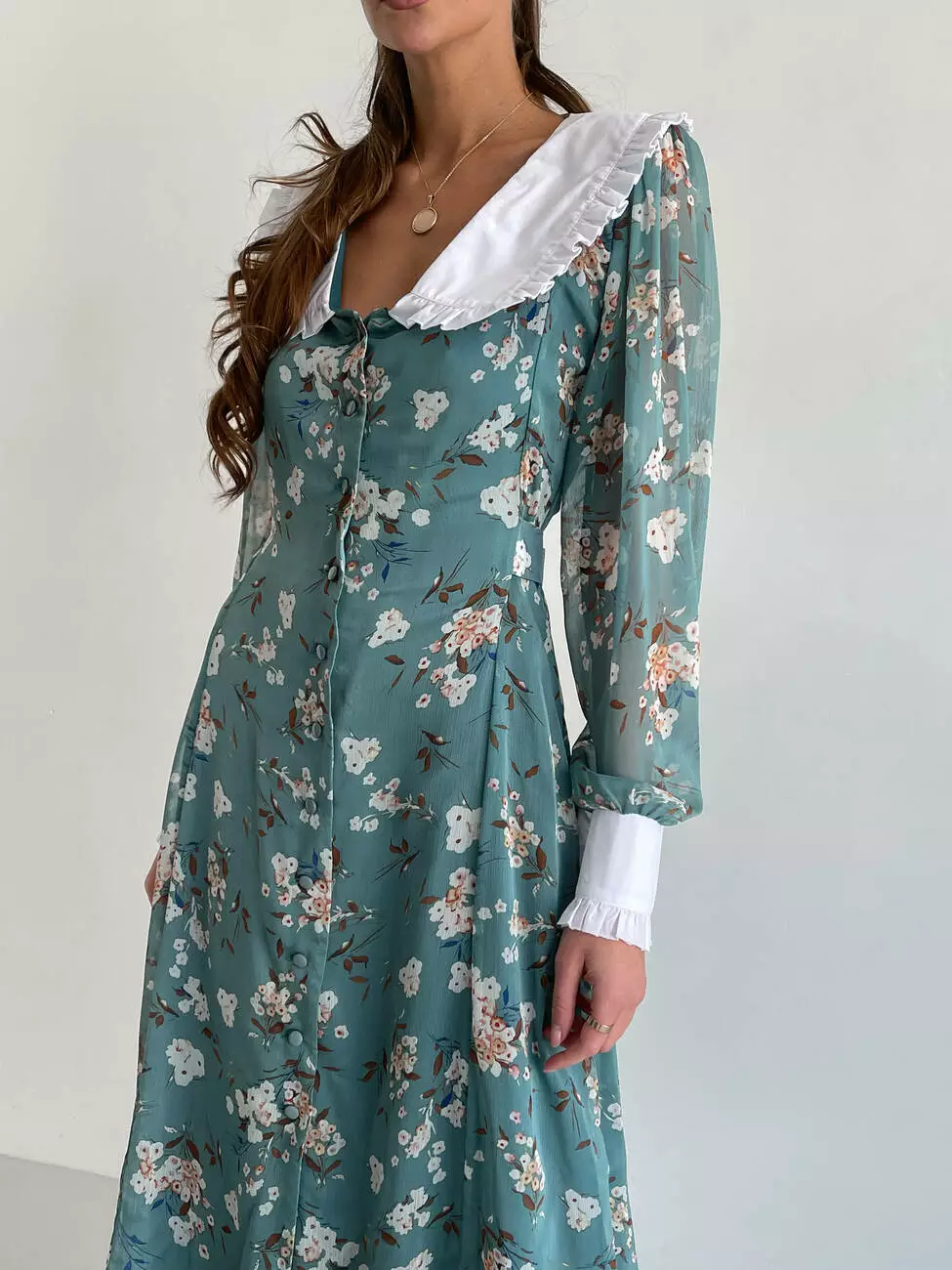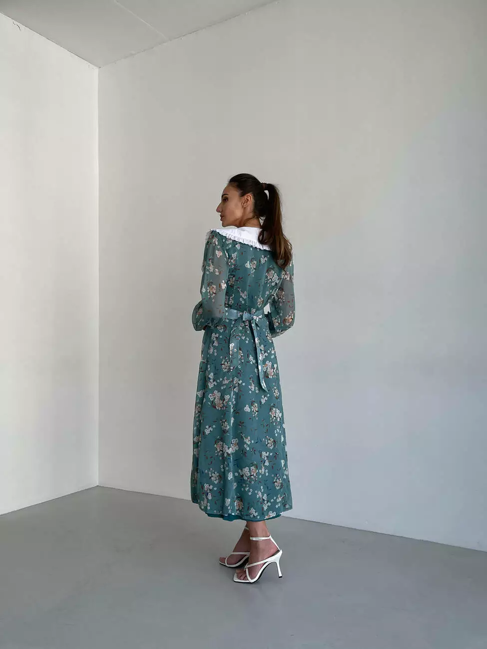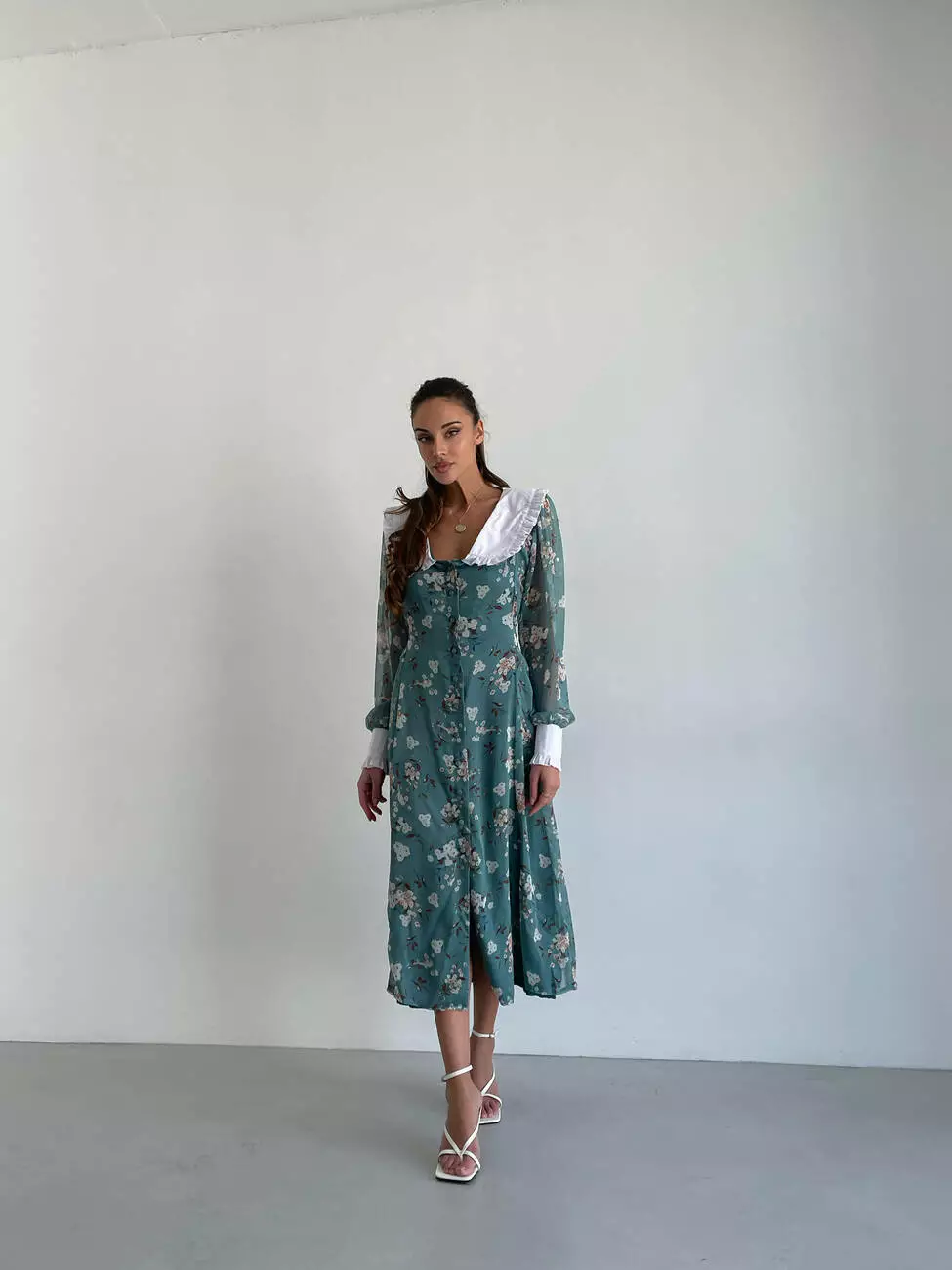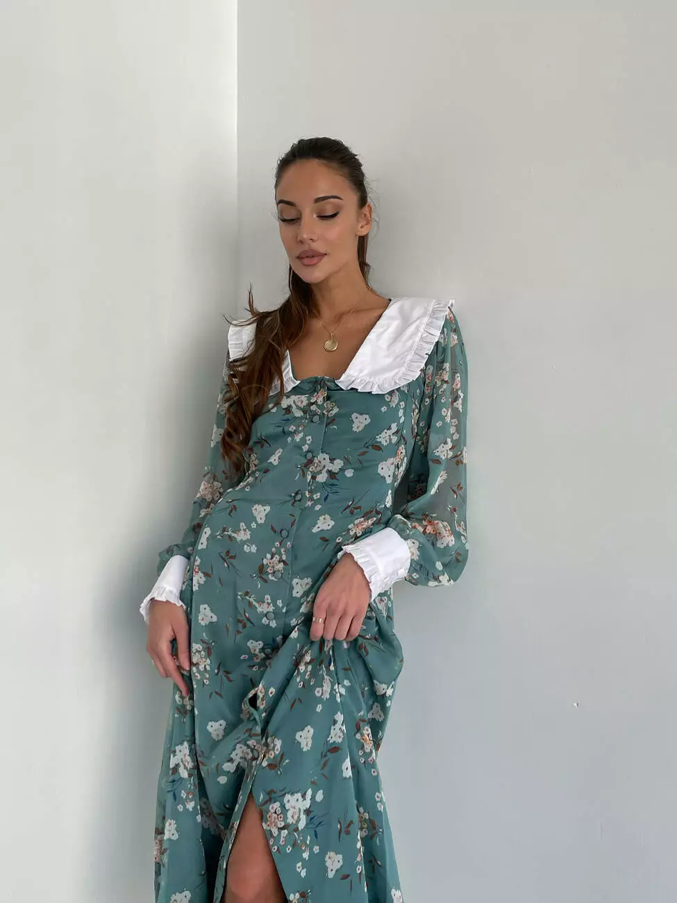 Жіноча шифонова сукня VENETTA з білим комірцем довжини міді з квітковим принтом зеленого кольору