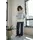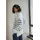Подовжений светр у смужку має довгі широкі рукави з манжетами, високу горловину та манжет по низу виробу.