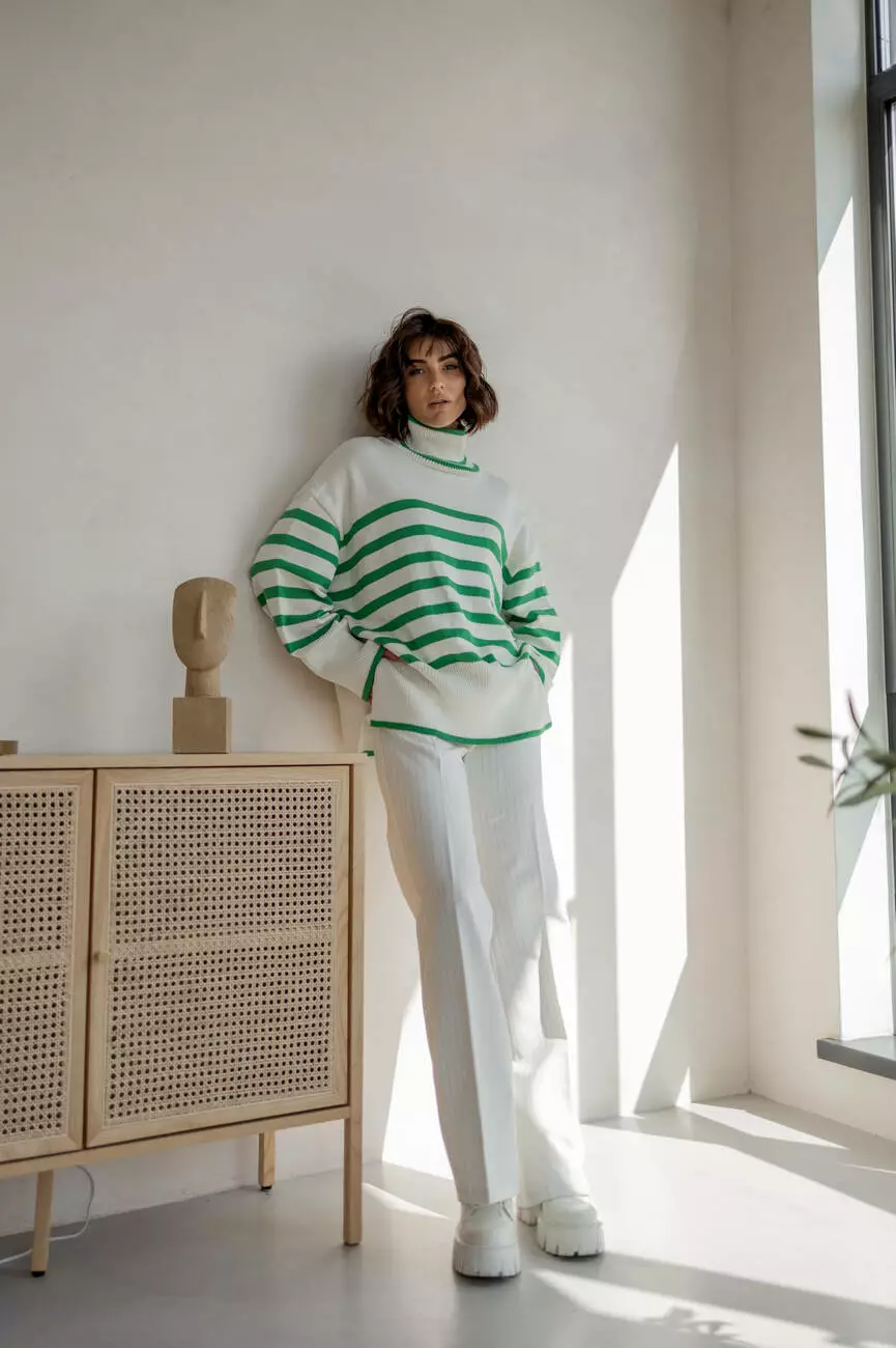 Жіночий бавовняний светр Тільняшка в смужку під горло колір молоко-трава