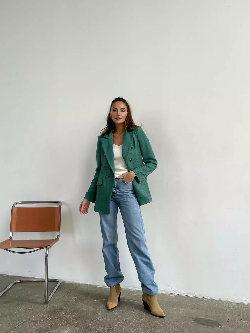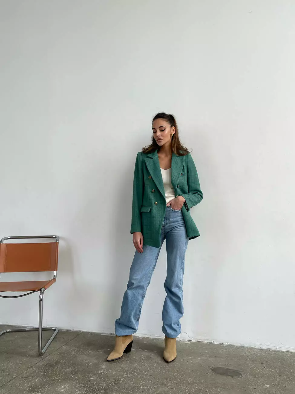 Стильна модель має напівприталений крій, комір з лацканами, має функціональні кишені та елегантні ґудзики додають жакету особливий шарм.